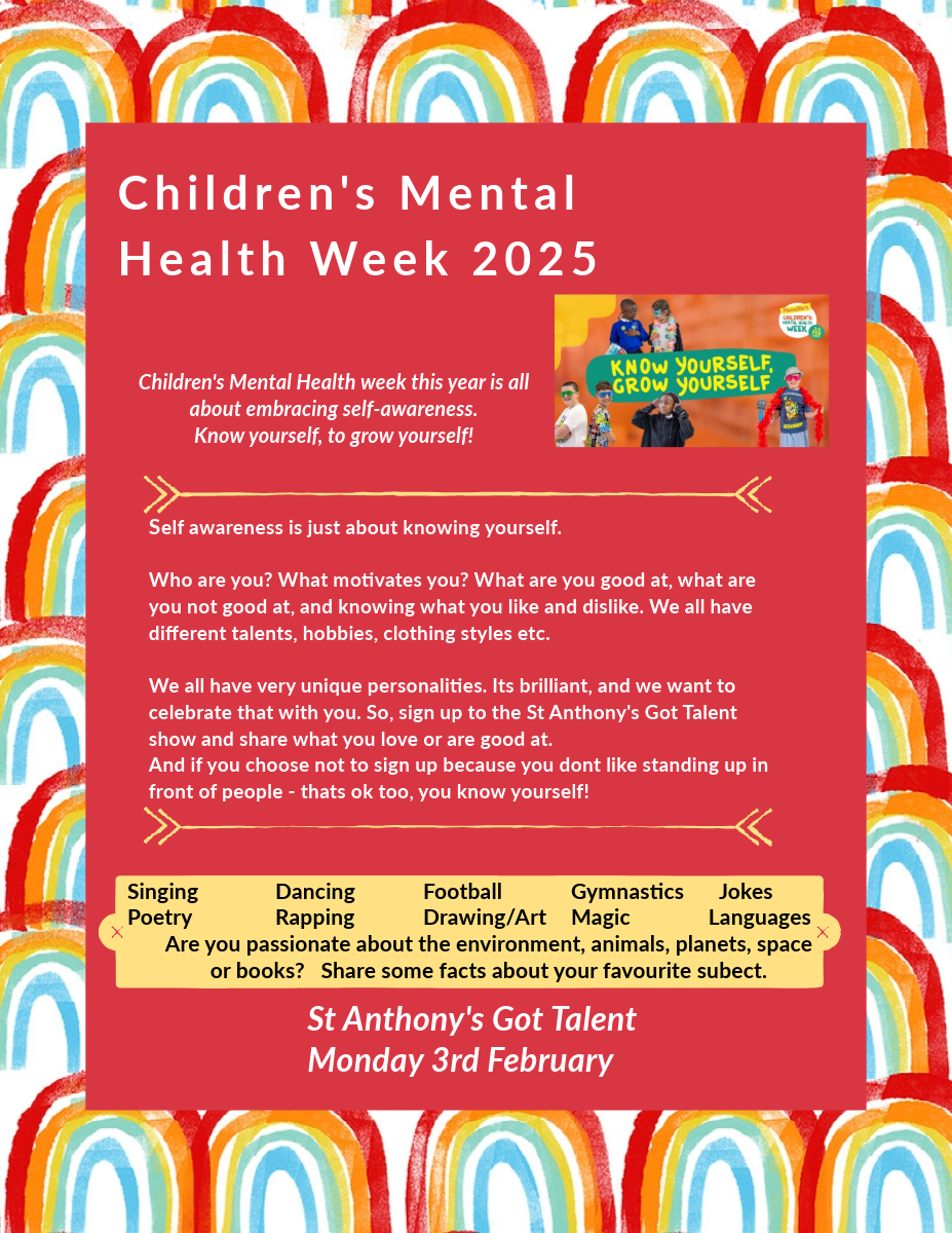 Newsletter - September 2025.pdf JULY NEWSLETTER 2025-compressed.pdf 27 June Final 2025.pdf June 13th bulletin .pdf 23rd May 2025.pdf 11 April 2025.pdf March Newsletter.pdf 21 February 2025.pdf St Davids Day.pdf St Anthony's Newsletter January 2025.pdf Letter to parents 17.01.25.pdf Childrens mental health week poster.png Diary dates .pdf December 20th 2024.pdf December 13th 2024.pdf December 6th 2024.pdf November 29th 2024.pdf November 22 2024.pdf November 15th 2024.pdf November 8th 2024.pdf October 25th 2024.pdf October 18th 2024.pdf October 11th 2024.pdf October 4th 2024.pdf September 27th 2024.pdf 20th September 2024.pdf School Reminders.pdf September 13th 2024.pdf September 6th 2024.pdf Water Smart Leaflet - Bilingual.pdf July 17th 2024.pdf July 12th 2024.pdf July 5th 2024.pdf June 28th 2024.pdf June 21 2024 .pdf June 14 2024.pdf June 7th 2024.pdf May 24th 2024.pdf May 17th 2024.pdf May 10th 2024.pdf May 3rd 2024.pdf April 26th 2 2024.pdf April 19th 2024.pdf April 12th 2024.pdf March 22nd 2024.pdf March 15th 2024.pdf March 8th 2024.pdf March 1st 2024.pdf February 23rd 2024.pdf February 2nd 2024.pdf January 26th W2.pdf January 19th W1.pdf January 12th 2024 W3.pdf December 21st 2023.pdf December 15th.pdf December 8th 2023 W3.pdf December 1st 2023 W2.pdf November24th 2023 M1.pdf November 17th M3.pdf November 10th 2023 M2.pdf October 27th 2023 .pdf October 20th 2023 wk 3.pdf October 13th 2023 M2.pdf October 6th 2023.pdf September29th 2023 M3.pdf September 22nd 2023 M2.pdf September 15th 2023 M1.pdf September 8th 2023 M3.pdf July 20th 2023.pdf July 14th 2023.pdf July 6th 2023.pdf June 30th 2023 m2.pdf June 23rd 2023 M1.pdf June 16th 2023 M3.pdf June 9th 2023.pdf May 26th wk1.pdf May 19th wk 3.pdf May 12 2023 wk 2.pdf May 5th 2023 wk 1.pdf April 27th 2023 M3.pdf April 21st 2023 M2.pdf March 31th 2023.pdf March 24th 2023 M3.pdf March 17th 2023 M2.pdf March 3rd 2023.pdf February 16th 2023 M2.pdf February 10th 2023 M1.pdf January 20th 2023 .pdf January 13th 2023.pdf December 22nd 2022.pdf December 16th 2022 M1.pdf December 9th 2022 M3.pdf December 2nd 2022 M2.pdf November 25th 2022 M1.pdf November 18th 2022.pdf November 11th 2022 M2.pdf October 28th M1.pdf October 21st 2022 M3.pdf October 14th 2022 M2.pdf October 7th 2022 M1 .pdf September 30th M3.pdf September 23rd 2022 M2.pdf September 16th 2022 M1.pdf September 9th 2022 M3.docx July 15th 2022.pdf July 8th 2022 M2.pdf July 1st 2022 M1.pdf June 24th 2022 M3.pdf June 17th 2022 M2.pdf June 10th 2022 M1.pdf May 27th 2022 M1.pdf May 20th 2022 M2.pdf May 13th 2022 M1.pdf May 6 2022 M3.pdf April 29th 2022 m2.pdf April 8th 2022.pdf April 1st 2022 M3.pdf March 25th 2022 M2.pdf March 18th 2022 M1.pdf March 11th 2022 M3.pdf March 4th 2022.pdf February 11th 2022 m3.pdf February 4th 2022 M2.pdf Clwb Hapus Childcare Support Leaflet (1).pdf January 28th 2022.pdf January 21st 2022 m3.pdf December17th2021.pdf December 10th 2021.pdf December 3rd 2021.pdf November26th 2021.pdf November 19th 2021.pdf November 12th 2021.pdf November 5th 2021.pdf 22 October 2021.pdf Help_With_Reading_Poster_English (1).pdf 15th October 2021.pdf 8th October 2021.pdf 1st October 2021.pdf September 24th 2021.pdf September 17th 2021.pdf September 10th 2021.pdf September 3rd 2021 M1.pdf July 16th 2021.pdf July 9th.pdf Job Advert.docx July 2nd 2021.pdf June 25th 2021.pdf June 18th 2021.pdf May 28th 2021.pdf May 21st 2021.pdf May 14th 2021.pdf May 7th 2021.pdf Hero stamp.pdf April 30 2021..pdf April 16 2021.pdf March 26th 2021 March 19th 2021 March 12th 2021 March 5th 2021 February 26th 2021 February 12th 2021 February 5th 2021 January 22nd 2021 January 15th 2021 January 8th 2021 January - March 2021 Dinner Menu Newsletter 04/12/2020 27th November 2020 20 November 2020 Interim School Dinner Menu Nov 20 November 13th 2020 November 6th 2020 October 23rd 2020 October 16th 2020 October 9th 2020 Christmas for school posters. October 2nd 2020 September 25th 2020 September 18th 2020 September 11th 2020